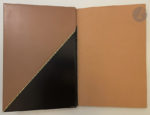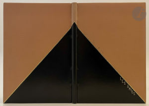 Box rose et box noir séparés obliquement par une guirlande de points dorés sur les plats et le dos, nom de l'auteur en lettres argentées et titre en lettres dorées de part et d'autre de la guirlande dorée sur le premier plat, dos lisse, doublures bords à bords proposant le même décor, gardes de soie rose, doubles gardes de papier rose orné d'un décor peint composé de pastilles noires et de filets argent, tranches dorées sur témoins, couverture conservée, étui doré (A. Székely).