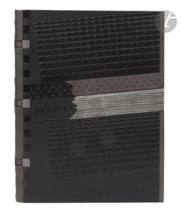 Reliure révorim, plats en polyuréthane moulé noir, pièce de veau gris rayé de noir orné du titre au palladium sur le plat supérieur, coutures apparentes, doublures de daim ocre, couverture et dos, chemise et étui cartonnés (Jean de Gonet, Antonio P. N., 1987)