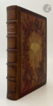 visage doré rayonnant entouré de feuilles de chêne, dos à nerfs, grecques, filets et fleurons dorés en encadrement à l'intérieur, doublures et gardes de soie jaune brochée, tranches dorées sur témoins, couverture et dos conservés, étui bordé (Stroobants).