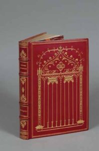plat richement décoré de filets, poinçons, fleurons et petits fers dorés formant une composition d'inspiration gothique, dos à 4 nerfs surlignés, second plat frappé au centre d'un fleuron composite doré, chasses dorées d'un double filet doré ; gardes bordées de maroquin rouge, ornées d'un riche encadrement doré à la roulette, toutes tranches dorées, couvertures conservées, étui (Durvand). Ouvrage illustré de 32 compositions in texte gravées sur cuivre en couleur d'après Edmond Malassis par Louis Mortier. Tirage limité à 170 exemplaires numérotés ; un des 150 exemplaires sur vélin Blanchet. Premier tirage des illustrations d'Edmond Malassis. Cette pièce en un acte d'inspiration médiévale est assez curieuse dans l'œuvre de Banville ; elle met en scène un poète condamné à la pendaison pour des vers sur Louis XI, qui tente de se racheter par le biais d'intrigues amoureuses… Elle fut créée en juin 1866 à la Comédie-Française, avec Coquelin dans le rôle de Gringoire. Elle est dédiée à Victor Hugo. Édition tirée par l'Imprimerie Nationale pour Louis Conard. Lucien Durvand (relieur) exerça à Paris, rue Pré-aux-Clercs, de 1890 à 1924.
