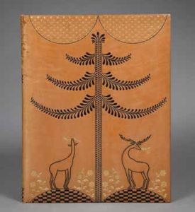 quatre coins d''un motif carré de style Art Déco figurant une silhouette de femme nue, dos lisse, tranche de tête dorée, couvertures conservées (Kieffer). Ouvrage illustré de 20 eaux-fortes hors texte en couleurs de Louis Icart. Tirage à 525 exemplaires ; ici l'un des 55 exemplaires de tête sur Japon impérial, après un exemplaire unique sur Chine. L'ouvrage comporte monté sur onglet le fac-similé d'un feuillet autographe de Colette sur papier bleu, dans lequel l'auteure indique : "de deux romans (Minnie et Les égarements de Minnie) qui ne portèrent pas ma signature, j'en ai fait un seul : l'Ingénue libertine. La première partie trouve encore grâce à mes yeux ; je suis plus sévère pour la deuxième et dernière, superflue et qui sent le travail. Cette libertine aurait bien dû en rester à l'ingénuité".