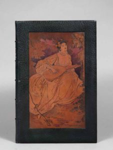 incisé et peint figurant une femme nue persécutée par un démon, dos à 4 nerfs, toutes tranches dorées, gardes encadrées de maroquin bleu nuit et frappées aux coins d'une fleur mosaïquée de maroquin brun, double filet doré encadrant la garde de soie beige texturée, contre-garde de même, couvertures conservées, étui (Marius Michel). Ouvrage illustré de 65 figures dessinées par Minartz et gravées par Paillard, dont un frontispice, une vignette de titre, 2 à pleine page et 61 dans le texte. Tirage à 138 exemplaires numérotés sur vélin de cuve du Maris, très fort et très blanc. Édition originale et premier tirage des gravures. Très bel exemplaire non ébarbé ; la plaque de cuir incrusté au plat de reliure reprend la vignette illustrant le poème « Les Quat'-z-Arts » p. 147 Provenance : Lucien Gougy (III - 19, 20, 21 novembre 1934, n°307)