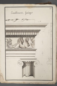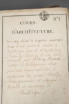 subsistent les cartons et la couvrure détachés ; reste une partie de la couture des f., taches, salissures, accrocs). Rare témoignage de l'enseignement donné en l'Ecole gratuite d'architecture fondée à Dunkerque en 1760. Ce travail a remporté le premier prix décerné le 23 juillet 1782, comme l'atteste la mention couvrant tout le premier feuillet, qui porte les signatures autographes de Gyselinck-Versmée et Barthelemy de Roo, respectivement directeur adjoint et secrétaire de l'école. Le volume se compose du feuillet portant la mention de prix, puis de 49 planches, dont 43 dessinée à l'encre et lavis, et 6 planches de texte. L'état du document est dégradé mais sa rareté justifierait une restauration. On joint 20 planches gravées d'architecture et 5 pages dont un titre du XVIe siècle, très usées.