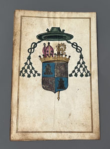 devote confrairie de Messieurs S. Roch & S. Eutrope desservie en la chapelle de Madame Ste Anne près Rennes. Une pièce manuscrite et peinte en couleurs et or, sur un bifeuillet de parchemin, 32 x 42 cm. déplié (rousseurs). Couverture ou page de garde ayant servi à un livre de compte d'une confrérie bretonne. La première page comporte le titre en rouge, bleu et or, sur ses deux tiers ; le tiers supérieur offre deux vignettes en couleurs et or montrant saint Mathieu et saint Bernard en prière. La quatrième page présente les armoiries de Henri de La Mothe-Houdancourt (1612-1684), évêque de Rennes de 1642 à 1661 (petite marque de pli sur les armes).