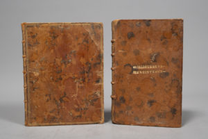(coiffes et 2 coins découverts, frottements). Manuscrit soigné à l'encre sur papier vergé, d'une même main. Il se compose d'une première partie « Principales époque de l'histoire » décrivant 12 périodes jusqu'à Charlemagne ([1] f. (titre), 9 pages chiffrées), puis « Succession des rois de France » de Pharamond jusqu'à Louis V dit le Fénéant ([12] pages), [12] f. blancs), puis « Extraits du premier [-troisième] tome de l'histoire de France du président Hénault » ([1] f. (titre), 113 p. chiffrées), couvrant jusqu'à la fin du règne de Louis XIV. Après 4 feuillets blanc, on trouve à la fin, d'une autre main : « !Première fédération générale des 83 départements de la France, qui a eu lieu le 14 juillet 1790 » ([3] pages). On joint : Mélanges divers. Tome 47e. XVIIIe siècle. In-8, veau havane moucheté, dos à 5 nerfs, pièce de titre fauve, tomaison frappée, caissons ornés, supra-libris doré (trav. de vers en tête et queue du dos). Recueil de citations, notes, observations extraites d'un ouvrage avec renvois aux pages d'origine. Une note moderne indique qu'il s'agirait des Mélanges curieux attribués à Saint-Evremond, 1706. Ecrit d'une même main à l'encre sur papier vergé, le volume se compose d'un feuillet de titre puis il est paginé de 14705 à 15000. Provenance : bibliothèque de l'abbaye cistercienne de Cîteaux (supra-libris doré). Soit 2 volumes.