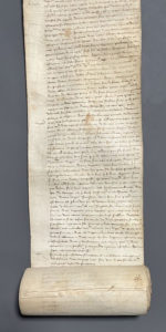 large, et 9,15 mètres de long. Il se compose de 15 feuillets cousus l'un à la suite de l'autre. La pièce concerne un conflit opposant les religieux de l'abbaye Saint-Martin de Sées aux paroissiens des environs. Il s'agit d'un transumptum, ou première copie conforme des actes originaux relatifs à l'instruction de l'enquête menée à l'époque. Elle a été rédigée en 1537, à Rônai (Orne), en présence d'un certain Jean Morel, et d'un grand nombre de paroissiens, dont les témoignages sont ici recueillis et transcrits. Il est fait mention au début du document d'un acte antérieur, en date de 1453 et rédigé en présence de Jean Morand, archidiacre. Il est très vraisemblable que cette pièce fasse suite à un ancien accord qui n'aurait pas été respecté par l'une ou l'autre des parties. En l'occurrence, il est fait mention dans certains passages de la rente due par les paroissiens à l'abbaye, sous forme de céréales, et du mauvais entretien de la grange dîmière destinée à recevoir les grains. Au fil de la lecture l'on relève les noms de nombreux témoins : Hilaire Plaignel, curé de Rônai, Pierre Onffray, Morel, Bonvoisin, Marguerite, et de leurs paroisses d'origine concentrées dans un périmètre restreint : Rônai, Commeaux, Montabard, Pierrefitte, Habloville.