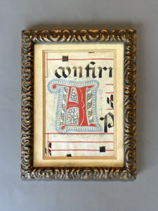 [Manuscrit enluminé (fragment), XVe siècle]. Lettrine d'antiphonaire, Italie ou Espagne, fin du XVème siècle. Sur velin, encre et pigments, 7,7 × 7,3 cm (lettrine), 14,5 x 9, 5 cm. à vue, sous verre et cadre moderne. Belle lettrine « A »...