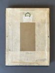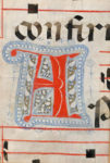 issue d'un antiphonaire sur parchemin. Lettre tracée à l'encre vermillon, entourée d'un fin décor de palmettes, rinceaux et frises de perles traités en filigranes à l'encre bleue, laissés en réserve sur un fond partiellement rehaussé à la poudre d'or. Le pourtour de ce décor présente des motifs bleus de spirales, croisettes et une étoile de David. Travail italien ou espagnol de la fin du XV e siècle. Étiquette manuscrite au revers indiquant « Espagne, XV e - XVI e siècle ». Un fragment similaire, également issu d'un antiphonaire, est conservé au Victoria Albert Museum à Londres (ms. 1581).