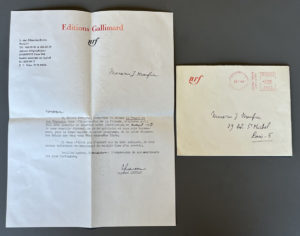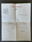 [Autographe]. QUENEAU (Raymond). Lettre dactylographiée signée, adressée à Jacques Monfrin (1924-1998), médiéviste et philologue. [Paris, cachet postal du 22 novembre 1965]. Une demi-page in-4, à en-tête des Editions Gallimard (trace pli en...