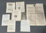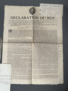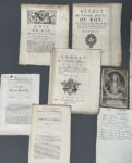 placard in-folio : Déclaration du roi « pour abolit l'usage des espèces d'or au premier may prochain... donné à Paris le 11 mars 1720. - 4 édits royaux imprimés in-4 en feuilles : - Validation des billets de banque « non signez à la main », 29 décembre 1719. - Arrêt concernant les monnaies, 2 février 1720. - Concernant les billets de banque, les actions de la Compagnie des Indes, le prix de l'or et de l'argent. 5 mars 1720. - Fabrication des Louis d'argent. Mars 1720. - Un portrait gravé de Law publié chez Crepy à Paris. - 2 articles de la Revue des Deux Mondes (1863).