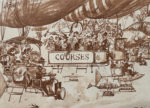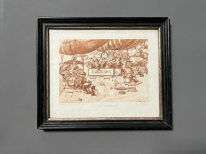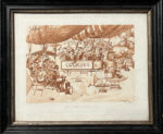 [Gravure]. [Aérostation]. Albert ROBIDA (1848-1926). Départ pour le Grand Prix. [Paris], Imp. Eudes, [1883]. Gravure d'après un dessin de Robida, tirée en bistre (12 x 16 cm.), sous verre et cadre de bois noir (20 24 cm.).