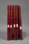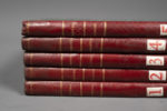 dorés, étiquette moderne (petits trav. de vers sur des mors, défauts intérieurs ci-dessous). Belle réunion de cinq volumes extraits de cette série parue en livraisons, chacun consacré à un pays, composé d'un faux-titre, d'un titre, d'une introduction, et illustré de planches gravées et coloriées, chacune accompagnée d'un feuillet de commentaire : Chine (24 planches, tache claire sur la 1ère) ; Turquie (24 pl. ; mouil. très claire en marge de qq. pages de texte) ; Russie (21 pl. (sur 24), auréoles pâles en début de vol., 1 page réparée) ; Angleterre (24 pl., mouillure claire étendue) ; Autriche (24 planches).