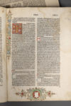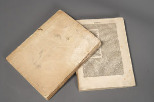 broché, anciennement relié, couv. muette moderne (couv. et dos usés, mouillure angulaire soutenue sur l'ensemble du vol., lacunes en marge des 1ers ff.). Troisième décade complète de cette édition incunable vénitienne en italien. Le volume contient au début une table portant sur les volumes précédents. Le titre de départ (fol. A1r°) est décoré d'une bordure florale, d'une grande initiale, et d'un écu destiné à recevoir des armoiries en pied de page, le tout peint en couleurs et or à l'époque. Nombreuses initiales peintes en rouge ou bleu sur l'ensemble du volume. (ISTC il00253000 ; GW M18516). 2. LUCAIN. [Pharsalia. Cum commentariis Omniboni Leoniceni]. Venise, N. Battibovi, 1486 [au colophon] : impressu[m] a Nicolao battiboue alexa[n]drino anno domini Mcccclxxxvi tertio idus maii. In-folio, [170 (sur 186)] f. [sign. c-x 8, y-z 6, &6], couture de l'époque sur 3 doubles-nerfs, sans reliure (1er et dernier cahier détachés, 1er f. un peu jauni, rares rousseurs, très pâle moouillure dans qq. marges, dernier f. usé avec trou sans manque ; qq. piq. de vers traversent le volume sans gravité ; 2 premiers cahiers, a et b, en déficit). Belle édition vénitienne de la Pharsale, avec les commentaires du philologue humaniste italien Omnibonus Leonicenus (1420-v. 1500), auteur notamment d'éditions critiques de Cicéron et Quintillien. Exemplaire grand de marges. Annotations anciennes soignées en début de volume. (ISTC il00302000 ; Goff L302 ; HC 10238*). Soit 2 volumes.