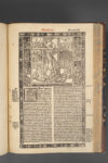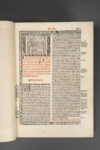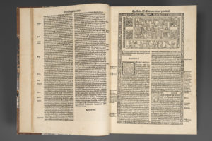 Moylin pour Etienne Gueynard, 1520]. Fort in-folio, demi-cuir de Russie havane à coins XIXe s., dos à 5 nerfs, titre doré, filets à froid, tranches marbrées (mors fendus, attache faible des plats, coiffes et coins usés, dos frotté ; titre et 25 f. en déficit, qq. petits manques sur 5 f., qq. déch. restaurées, lég. traces digitales en marge). Belle édition de la Vulgate imprimée à Lyon, en rouge et noir, sur 2 colonnes, illustrée de vignettes, et de nombreuses initiales, le tout gravé sur bois. Le texte comporte les annotations d'Alberto Castellano, et les notes historiques de Johannes de Gradibus. Sign. aa 2-8, bb 8, a-z 8 (sauf aa 1 et n 1), ?6, A-B 8, C 6, D-T 8, U 6, aa-mm 8]. Il manque la page de titre, le f. XCVII, et 24 f. à la fin après le colophon ; qq. lacunes aux f. aa2, 244, 247, 320, 325). (USTC 145185 ; Baudrier XI, 251 ; Bibles Paris 791).
