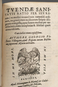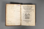 1575. Deux parties en un volume in-16, 476 p., [6] f., [sign. A-Z8 AA-GG8 HH4], veau fauve époque, dos à 4 nerfs, titre ms. sur étiq. papier, fleurons dorés, plats ornés d'un double encadrement de 3 filets à froid, avec fleurons central et angulaires dorés (dos passé, 2 coins usés, garde sup. mq., trav. de vers aux plats et dans qq. marges en fin de vol., piqûre traversant sans gravité en début de vol., mouill. claires en tout début et fin de vol.). Belle édition de poche de ce célèbre traité médiéval pour conserver la santé ; la seconde partie débute page 362 avec une page de titre particulière et renferme : Tvendae sanitatis ratio… par le médecin allemand Georgius Pictorius (1500-1569). Ex-libris manuscrits anciens au titre et aux contreplats. (USTC 170261).