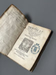 N6], parchemin souple époque à rabats, dos lisse, titre à l'encre, trace de lacets (plat sup. un peu bruni, garde sup. absente, discrète répar. adhésif au v° de la pl., petit trou en marge des 4 premiers f., petit mq. marg. f.11, rares rousseurs). Edition originale imprimée en caractère italiques, et illustrée d'une planche dépliante généalogique. Marque du libraire au titre, bandeaux et initiales gravées sur bois. Les deux derniers f. probablement blancs à la fin ont été renouvelés. Provenance : Charles Henneguier (1811-1872 ; cachet ex-libris au titre) ; cachet d'établissement religieux moderne au contreplat inf.