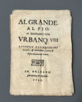 ZAMBECCHARI (Lodovico, pseud. de Juan Antonio de Vera). Al grande al pio, al beatissimo papa Urbano VIII. In Orleans, con licenza de Superiori, s.n., 1633. In-4, 44 p., en feuilles (défauts dont marque de pli en 4, un trou traverse le volume, taches...