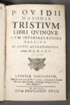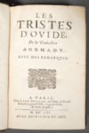 OVIDE ; [MAROLLES (Michel de)], trad. Les tristes = Tristium libri quinque cum interpretatione gallica… A Paris, chez Louis Billaine, 1661. Deux parties en un volume in-8, [8] f., 178 p. à double pagination soit [356] p., p. 179-460, [9] f....