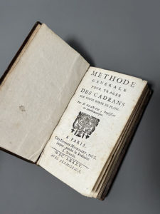tranches jaspées (plat inf. taché, rousseurs, pl. rognées court avec qq. petites atteintes aux figures). Deuxième édition de ce traité de gnomonique, illustrée de 12 planches dépliantes gravées sur cuivre.