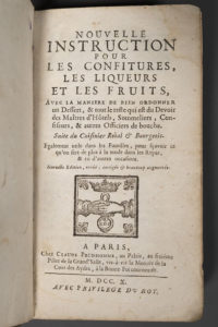 [Gastronomie]. [MASSIALOT (François)]. Nouvelle instruction pour les confitures, les liqueurs et les fruits, avec la manière de bien ordonner un dessert... Nouvelle édition... A Paris, chez C. Prudhomme, 1710. In-12, [10] f., 480 p., [12] f., pl....