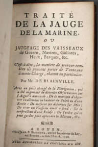 [Marine]. MOITOIRET DE BLAINVILLE (Antoine). Traité de la jauge de la marine, ou Jaugeage des vaisseaux de guerre, navires, galiotes… A Rouen, chez J.-B. Besongne, 1728. In-12, 82 p., [3] f. (privil.), pl., fig., veau havane époque, dos lisse,...