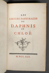 [LONGUS]. Les amours pastorales de Daphnis et Chloé. S.l., s.n. [Paris], 1745. Petit in-8, [5] f., 159-XX p., fr., pl., maroquin rouge époque, dos lisse richement orné, pièce de titre maroquin vert, filet et jeu de fleurons dorés bordant les...