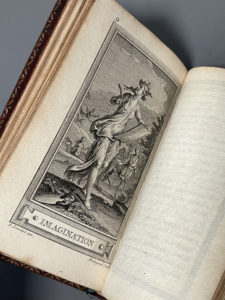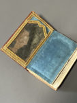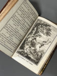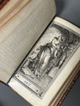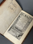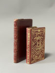 dos lisse orné, décor à la plaque doré répété aux deux plats avec 2 colombes et au centre un couple accompagné d'un chien, doublure et garde de satin bleu, demi-garde de papier gaufré et doré ; miroir bordé d'un ruban doré au contreplat supérieur, pochette à soufflet au contreplat inférieur. Date d'après le calendrier dépliant ; titre et 12 vignettes gravées. - GRAVELOT. Almanach iconologique année 1768. Quatrième suite : êtres métaphysiques. A Paris, chez Lattré, 1768. 123 x 74 mm. rel. incl. Maroquin rouge, dos lisse, titre et fleurons dorés, filet doré aux coupes, roulette int., tranches dorées (petits frott., peites taches d'encre au calendrier). Titre et 12 vignettes allégoriques gravées d'après Gravelot. Soit 2 volumes.