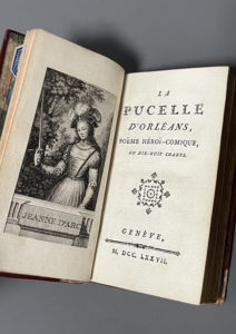 VOLTAIRE. La pucelle d'Orléans, poëme héroï-comique, en dix-huit chants. Genève, s.n., 1777. In-18, [2] f., 228 p., frontispice gravé sur cuivre, maroquin rouge, dos lisse orné, pièce de titre maroquin fauve, triple filet bordant les plats...