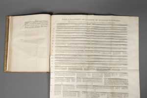 (certificat, errata), pl., maroquin havane moderne, dos à 5 nerfs, titre, lieu et date dorés, double filet doré bordant les plats, armes dorées au centre, double filet doré aux coupes, dentelle intérieure, tête dorée, non rogné (titre bruni,auréoles margin. en début et fin de vol., qq. rousseurs, faux-titre en déficit). Edition originale, comprenant un grand tableau généalogique dépliant hors-texte. Bel exemplaire, dans une élégante reliure non signée, aux armes des Montesquiou. (Saffroy 45992).
