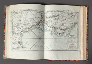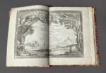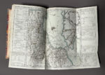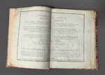 traversés par les grandes routes, et accompagné d'un itinéraire instructif et raisonné sur chaque route… Dressé par le sieur Michel,... mis au jour et dirigé par le sieur Desnos,... A Paris, [chez Desnos], 1785. In-4, demi-chagrin rouge moderne, dos à 5 nerfs, auteur, titre, date et fleurons dorés (mouillure claire au pli d'une carte). Dernière édition in-quarto, enrichie, de cet atlas utile aux voyageurs. Elle se compose de 2 planches doubles gravées (titre et dédicace à Cassini), et de 20 planches de cartes doubles ou dépliantes en partie coloriées : une carte d'assemblage, une carte générale et 18 cartes de détail, dont la première est un plan de Paris. On trouve comme souvent, relié à la suite : - BRION. Coup d'oeil général sur la France. Paris, Desnos, [1765], 15 p. - PROSPECTUS du Guide des voyageurs… suivi de Catalogue alphabétique des routes royales… 17 p. Bel exemplaire établi avec soin et dont les cartes ont été tirées sur papier azuré. Enrichi d'une note manuscrite du XVIIIe siècle donnant un itinéraire de diligence aux alentours de Cussy (Bourgogne).