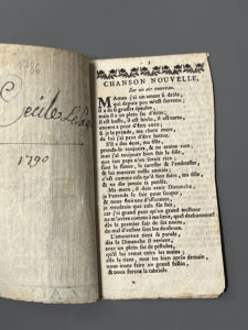 qq. lettres du 1er f.). Composé de 8 pages comprenant 5 chansons ; suivi de 4 pages offrant 2 chansons. Ex-libris manuscrit Cécile Lesage daté de 1790.