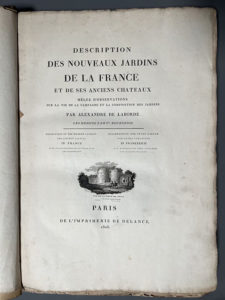 [Jardins]. LABORDE (Alexandre de). Description des nouveaux jardins de la France et de ses anciens châteaux, mêlée d'observations sur la vie de la campagne et la composition des jardins. Paris, Delance, 1808. Grand in-folio, [2] f., 226 p.,...