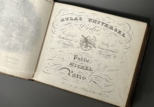 [Atlas]. MICHEL, éd. Atlas universel dédié au général baron de Richemont, ex-commandant d'école St Cyr. Paris, Michel fils aîné, Lecointe et Pougins, 1834. In-16 oblong (10 x 12 cm. hors rel.), veau vert bronze époque, dos lisse, titre...