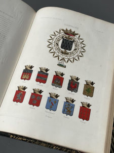 nerfs ornés, titre doré, caissons ornés (texte un peu bruni, qq. rousseurs par ailleurs). Premier ouvrage d'ampleur et exhaustif sur le sujet, amplement illustré de plus de 650 armoires, dessinées et gravées par H. Traversier, réparties sur 78 planches dont 29 ont été finement coloriées. Provenance : duc de Vallombrosa (ex-libris gravé). (Saffroy 15948).