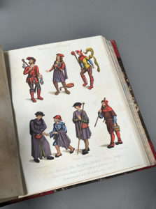 LOUANDRE (Charles). Les arts somptuaires. Histoire du costume et de l'ameublement et des arts et industries qui s'y rattachent… Paris, Hangard-Maugé, 1857-1858. 4 parties en 3 volumes in-4, demi-maroquin rouge à coins, dos à 5 nerfs, titre et...