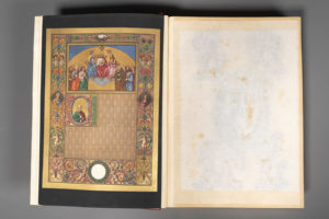 centre, et de ses initiales couronnées aux angles, le tout doré, double filet doré aux coupes, doublures et gardes de satin moiré vert, contreplats bordés de maroquin orné d'une dentelle dorée, tranches dorées (frott. sur un coin). Très bel exemplaire bien relié et entièrement sur onglets, de ce fac-similé remarquable, entièrement imprimé en chromolithographie. Il a paru simultanément un volume de transcription du texte qui n'est pas joint ici. Le tirage fut limité à 850 exemplaires.