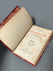 Édition originale, remise en vente avec une page de titre renouvelée portant la mention de deuxième édition. Le texte parut une première fois en 1874 à l'adresse de Dentu sous le titre « Le drageoir à épices » et peu d'exemplaires furent vendus, le reste du tirage a été employé pour cette édition. Tiré à 300 exemplaires numérotés, celui-ci n° 107. Provenance : Jacques-Émile Blanche (1861-1942), peintre et écrivain, par descendance.
