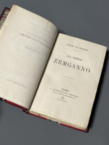 GONCOURT (Edmond de). Les frères Zemganno. Paris, G. Charpentier, 1879. In-18, maroquin poli cerise à coins, dos à 5 nerfs, auteur et titre dorés, caissons ornés, tête dorée, non rogné (coins un peu noircis). Édition originale : un des 100...