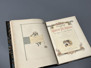 GRASSET. MARCILLY (Charles), éd. Histoire des quatre fils Aymon, très nobles et très vaillants chevaliers. Illustré de compositions en couleurs par Eugène Grasset. Gravure et impression par Charles Gillot. Paris, Launette, 1883. In-4,...