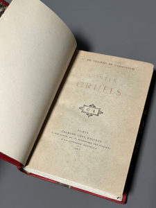 VILLIERS DE L'ISLE-ADAM (Auguste de). Contes cruels. Paris, Calmann Lévy, 1883. In-12, demi-maroquin rouge à coins, dos à 5 nerfs saillants, auteur, titre et date dorés, tête dorée, non rogné, couv. conservée [Bunoz]. Première édition...