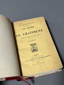 DOSTOIEVSKY (Fédor). Le crime et le châtiment. Traduit du russe par Victor Derély. Paris, Plon, 1884. 2 volumes in-18, demi-chagrin rouge, dos à 5 nerfs, auteur, totre, tomaison et date dorés, tête dorée, non rogné [Bunoz]. Première édition...