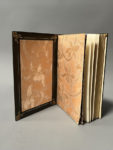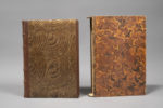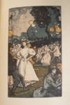 et peint enchâssée, contreplats bordés de maroquin orné d'un filet à froid et d'un filet doré et de 4 fleurs stylisées mosaïquées aux angles, doublure et garde de satin brodé sable à motif floral, seconde garde de papier marbré, tranches dorées sur témoins, couvertures conservées, chemise demi-maroquin brun [Marius Michel], étui sans doute ajouté (dos un peu passé, accroc au bord de l'étui ; rousseurs sporadiques). Édition illustrée de 63 bois originaux en couleurs par Auguste Lepère, dont 4 à pleine page. Tirage à 250 exemplaires : 25 sur japon, 25 sur Chine et 200 sur papier d'Arches à la main. Celui-ci n'est pas justifié, mais tiré sur japon et contient, comme il se doit, une suite complète de toutes les gravures. Celles-ci, tirées sur Chine ou japon nacré fin, et ont été pour leur majeure partie montées par le relieur sur des feuillets supplémentaires répartis dans le volume. Splendide exemplaire, dans une reliure d'exception illustrée au plat supérieur d'une composition originale gravée et peinte, signée par Auguste Lepère. Elle montre une femme élégante debout de dos à côté d'une colonne, avec des mendiants assis à ses pieds. Enrichi du prospectus (volant) et d'une carte de visite autographe signée de Jean Richepin.