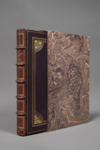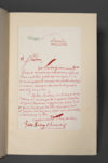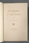 d'un filet doré et ornés d'un cadre formé de 4 filets et de fleurons angulaires dorés, double filet doré aux coupes, contreplats bordés de maroquin orné de 4 filets et d'une ligne de pointillés dorés, tranches dorées sur témoins, couv. et dos conservés, étui [Mertens] (dos lég. passé). Edition originale de cette étude, illustrée de 62 fac-similés de dédicaces, et du portrait de l'auteur gravé à l'eau-forte par Noyon. Tirage limité à 500 exemplaires. Celui-ci, sur japon nacré, est justifié sans numéro comme exemplaire nominatif de Charles Hérissey, imprimeur du livre. Il est enrichi d'un autre portrait gravé de l'auteur, et d'une lettre autographe signée de Barbey d'Aurevilly, datée de Samedi, adressée à une dame (1 p. in-8, en-tête « Never more »). Il accepte l'invitation de la destinatrice et assure qu'il fera tout son possible pour s'y rendre malgré « des occupations détestablement forcées » et « puisqu'on peut se présenter tard chez vous ». Est jointe une carte postale premier jour de 1974 au portrait de Barbey d'Aurevilly.