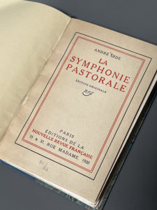 GIDE (André). La symphonie pastorale. Paris, NRF, 1919. In-16 demi-percaline azur à la Bradel post., pièce de titre bleue, fleurons et filets dorés, non rogné, couv. conservée, (lég. rouss.). Édition originale : un des 30 exemplaires d'auteur...