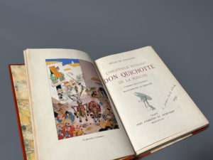DUBOUT. CERVANTÈS. L'ingénieux hidalgo Don Quichotte de la Manche. Illustrations de Dubout. Paris, Sous l'Emblème du Secrétaire, 1938. 4 volumes in-4, demi-chagrin poli orangé à bandes post., dos lisse, titre et tom. dorés, tête dorée. On...