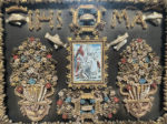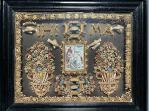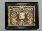 [Paperolle-reliquaire]. Grande paperolle du XVIIème siècle, figurant au centre une descente de croix en gravure aquarellée, entourée d'une riche composition de papiers roulés et dorés, quelques fleurs rouges et bleues dans deux grandes vasques....