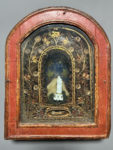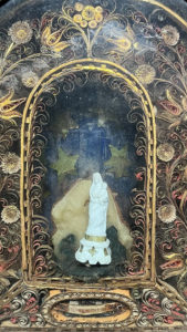 [Paperolle]. VIERGE A L'ENFANT dans une niche étoilée, XVIIIe siècle. Grands rinceaux de papier doré et de fleurs. 26 x 19 cm. à vue dans un cadre en bois peint et doré (34x28x8cm. ; la statuette a trourné sur son axe).
