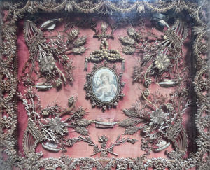 [Paperolle-reliquaire]. SAINT JEAN-BAPTISTE. XVIIème siècle. Au centre une image de St. Jean Baptiste coloriée, et dans chaque angle une corne d'abondance d'où partent des épis et des fleurs. Plusieurs reliques : St. Etienne, St Benoît… 27 x...