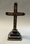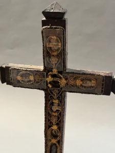 [Paperolle-reliquaire]. Petit crucifix avec papiers roulés XIXe siècle ; sous verre ; hauteur 29 cm. (croix et verre cassé, deux reliques absentes).