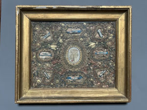 reliques de St. Pierre, St. Donat, St. Irénée, St Déodat, St. Faustin … 20 x 25 cm. à vue sous verre et dans un cadre ancien en bois doré (33 x 28 cm., accrocs minimes au cadre)